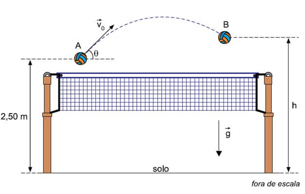 10. Em um jogo de vôlei, a bola é tocada pelo levantador no ponto A com v0 = 5 m/s e é atingida pelo atacante no ponto B, 0,5 s depois. De A para B a bola percorre uma trajetória parabólica contida em um plano vertical paralelo ao que contém a rede.