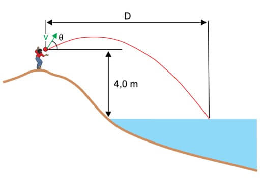 Sabendo que a pedra saiu da mão da criança a uma altura de 4,0 m acima da superfície do lago, considerando g = 10 m/s2 e desprezando a resistência do ar, o deslocamento horizontal D da pedra até atingir a superfície do lago foi