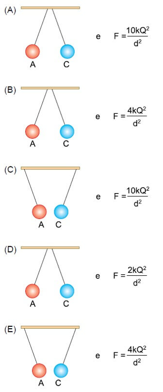 Utilizando luvas de borracha, o estudante coloca as três esferas simultaneamente em contato e, depois de separá-las, suspende A e C por fios de seda, mantendo-as próximas. Verifica, então, que elas interagem eletricamente, permanecendo em equilíbrio estático a uma distância d uma da outra. Sendo k a constante eletrostática do ar, assinale a alternativa que contém a correta representação da configuração de equilíbrio envolvendo as esferas A e C e a intensidade da força de interação elétrica entre elas.