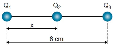 08. (FEI) As cargas Q1 = 9 mC e Q3 = 25 mC estão fixas nos pontos A e B. Sabe-se que a carga Q2 = 2 mC está em equilíbrio sob a ação das forças elétricas somente na posição indicada. Nestas condições: